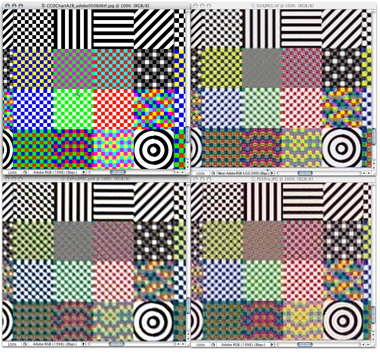 中央で太きなる同心円。上下左右の切り欠きは1ピクセルです。Nikon D2X は1ピクセルを切った角度の浅い線で解像できなくなっていますが、S3 Pro、S5 Proともに平均的に解像します。モアレは見ての通り。