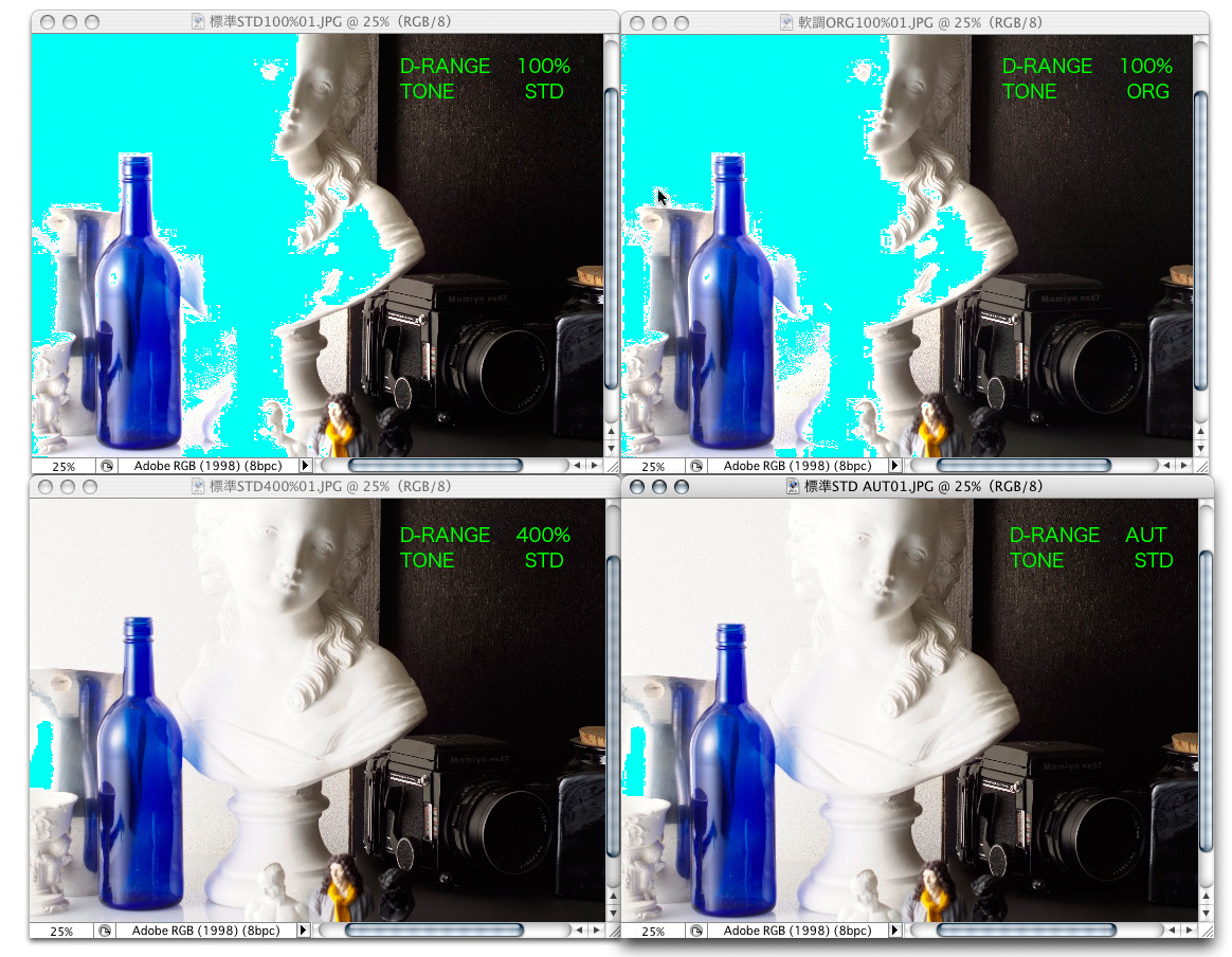 1段目がD-RANGE100%、TONE(コントラスト) STDでやや固めの設定。実はこれでも他のデジタルカメラよりは広いダイナミックレンジを持っている。