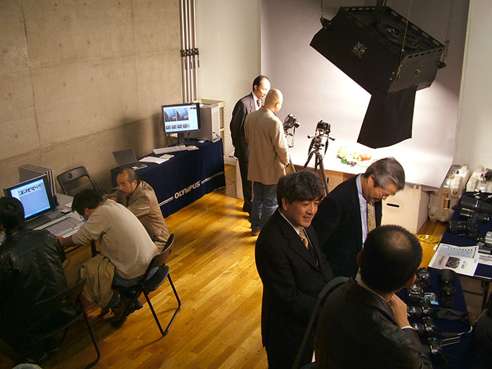 オリンパスさんは発売したばかりの、E-300とEシステムを始めとするレンズシステムの全てを展示。注目はダストリダクションシステムのデモンストレーションでした。見た目よりは操作性、写りのよいE300は一度は触って見る価値があります。OLYMPUS Masterもデモされていました。このソフトにほれ込んで購入する方もいらっしゃるかもしれません。