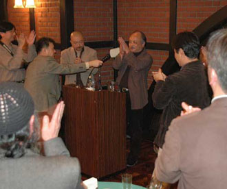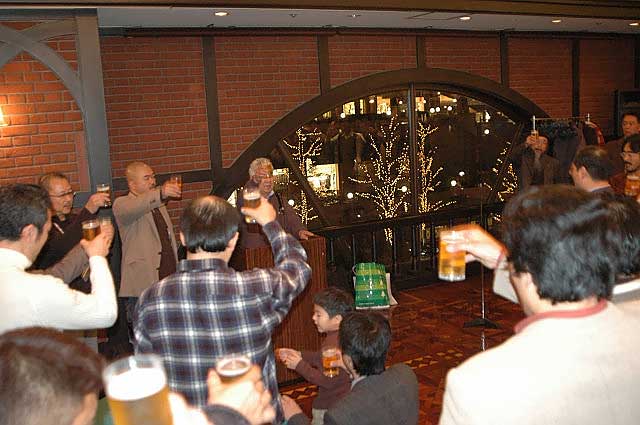 今回はエビスビヤガーデンの2階に会場を移しての大懇親会となりました。皆さん集まりが良く、気がつくと身動きの出来ないほどの盛況ぶりです。15分程早めにオープンし、乾杯の音頭は電塾塾生の最長老、メディアラボの吉川先生にとって頂きました。2時間たっぷりと運営委員を捕まえて質問攻めにする方、メーカーとユーザーなど、普段出来ないやり取りが各所で行われていた模様です。D1倶楽部の大庭氏が〆てまた、来年集まりましょう。お楽しみに。