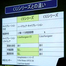 CGは「カラーグラフィック」の頭文字、 CEは「Creator's Edition」の頭文字です。決してEconomyの略ではありませんので、、、、。命名の通り、広く画像クリエイターに向けての商品という位置づけです。CGに比べてコストパフォーマンスを高めたモデルで、静止画と動画に向いているという説明でした。動画対応は特にCGシリーズにはない機能です。これはCEが元々は動画用のLCDを採用しているためです。CGと比べてワイド画面という点も見逃せません。