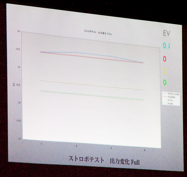 たぶん電塾以外では絶対に行われないだろう大検証大会が最後のプログラムです。実際に行うと時間がかかりすぎるので検証は事前に行われ、その結果の報告という形を取りました。検証にお手伝いいただいたのは大手ストロボメーカーのブロンカラー(アガイ商事)様、Profoto様、そして検証用カメラに現在最高の性能を持つデジタルカメラ(あたしが思うに)を販売するシュリロ様です。豪華なラインナップを見ているだけで、ため息が出ます。