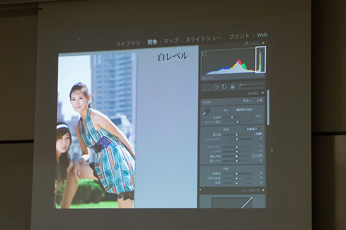 最後にLightroom4になって、現像パネルの「基本補正」の設定が変わった点について触れられました。2010バージョンまでは「露光量」、「白とび軽減」、「補助光効果」、「黒レベル」、「明るさ」、「コントラスト」となっていたものが、2012(現在)では「露光量」、「コントラスト」、「ハイライト」、「シャドウ」、「白レベル」、「黒レベル」となり、スライダーの方向性も統一されました。