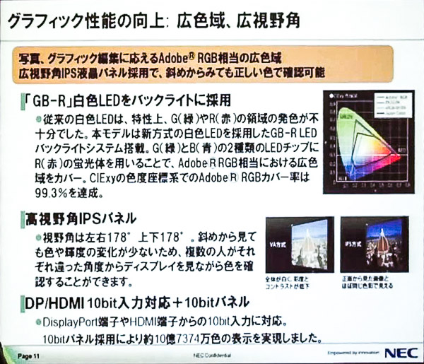 それらのモデルにもムラ補正機能は搭載されていることが多いのですが、NECのグラフィックモデルは64ドットごとに調整されているそうで、4Kディスプレイならおよそ1,000ポイントのムラ補正がなされているそうです。